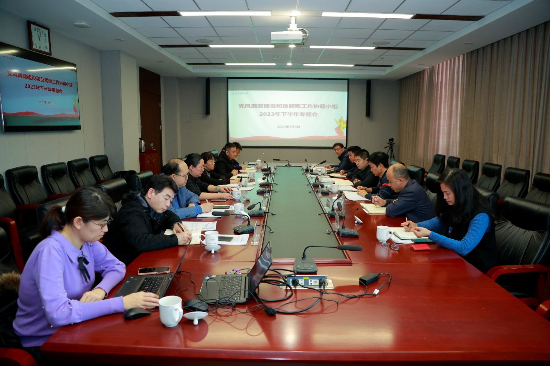 2024年1月4日上午,学校召开党风廉政建设和反腐败工作协调小组2023年度下半年专题会,纪委书记薛晏出席并主持会议,小组成员和纪检监察办公室全体人员参加会议。