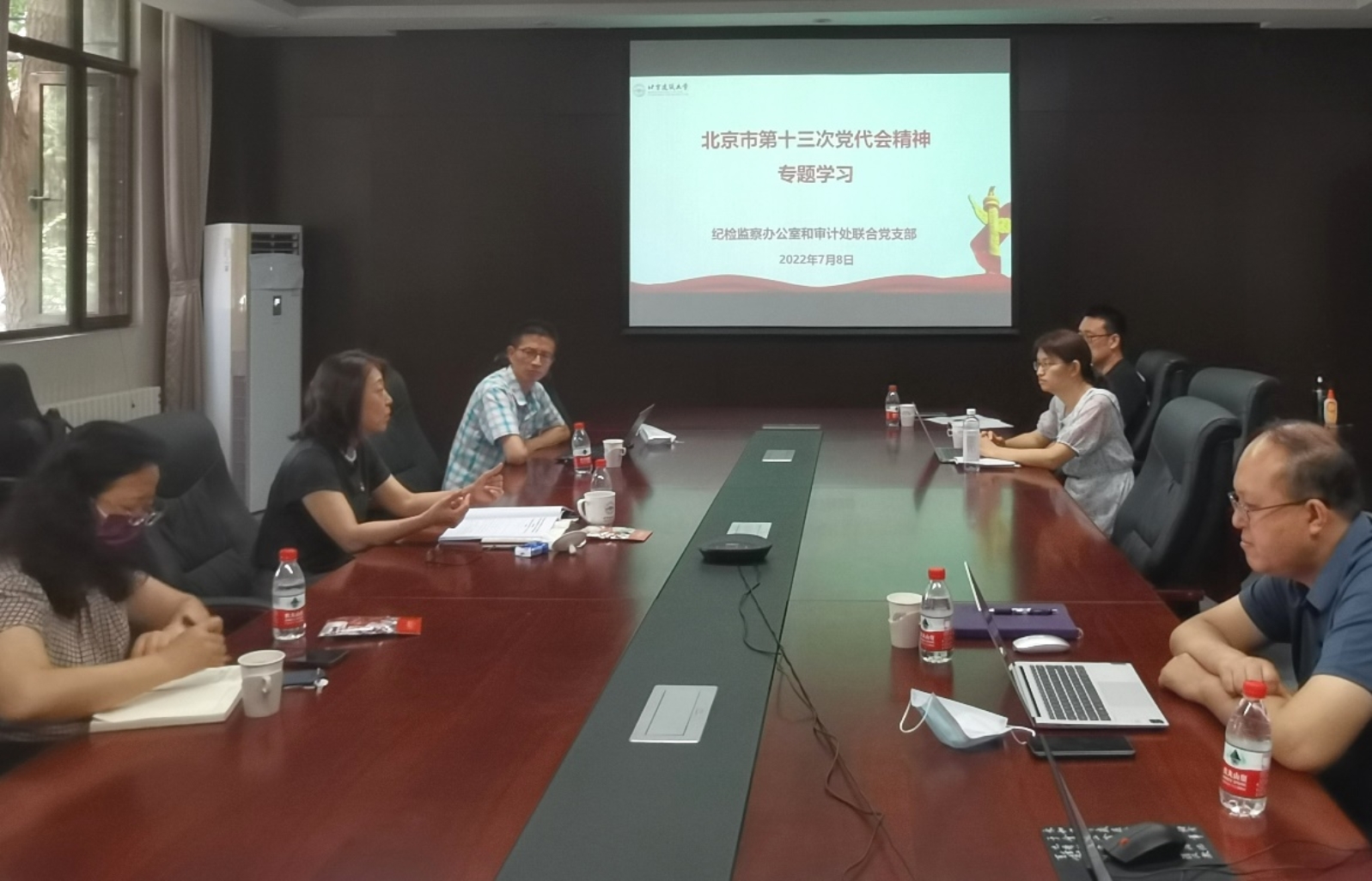 7月8日上午,纪检监察办公室和审计处联合党支部在西城校区第七会议室集体学习中国共产党北京市第十三次代表大会精神,深入学习领会、统一思想认识、明确奋进方向。纪委书记黄京红以普通党员身份参加学习,纪委副书记、党支部书记牛磊主持会议。