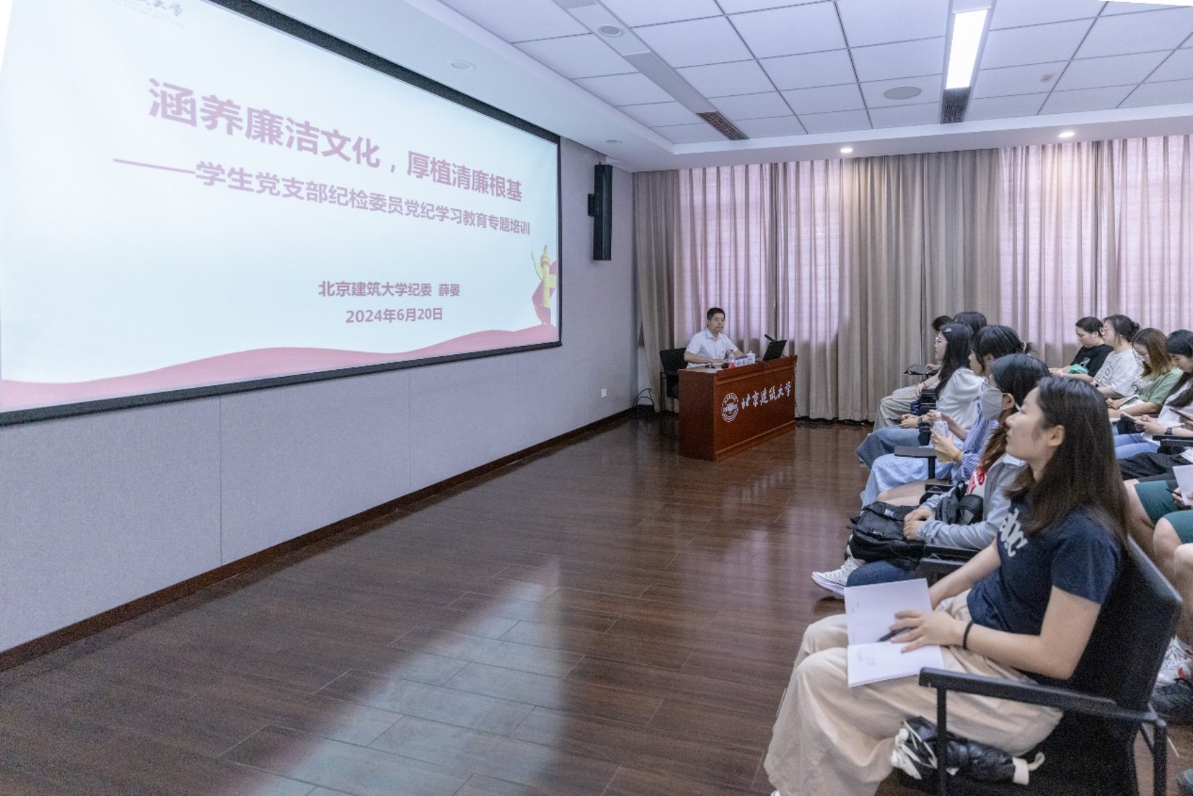 本次专题培训案例丰富,生动详实,既有警示教育案例,又有正面案例引领,是在学生党员干部中深入开展党纪学习教育、加强校风学风建设、大力营造校园廉洁文化建设,以及引导学生党支部纪检委员履行监督责任、提升监督意识的重要举措。本次培训,还向大家宣讲了校史中的红色故事和感人事迹,播放了“德廉建大”教育片,通过挖掘校史中的勤廉基因和廉洁元素,教育引导大家传承“爱国奉献、坚毅笃行、诚信朴实、敢为人先”的北建大精神。通过培训,同学们坚定了政治立场、增强了纪律意识、提升了身份认同,对全面从严治党向基层延伸起到积极的推动作用。