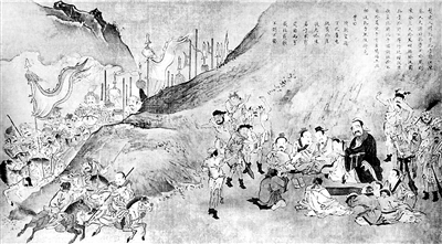 清代焦秉贞作《孔子圣迹图》之《在陈绝粮》。孔门师徒一行在陈国断绝了粮食,跟随的人都饿得爬不起来,孔子却依然讲诵诗书、抚琴歌咏。